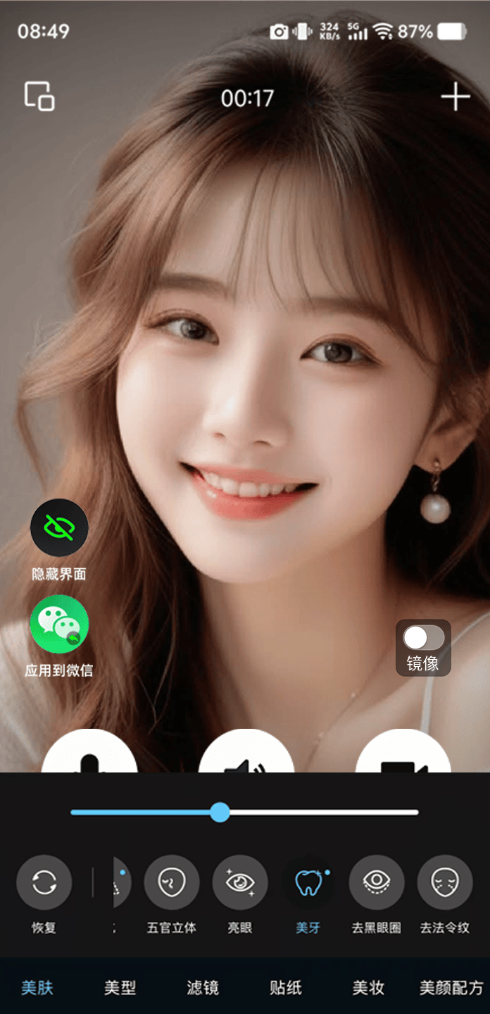 如果平时会用微信视频聊天跟朋友见面,这些护理带来的牙色效果变化在视频里可能还不够突出,那就可以用上微颜的美牙功能,它在视频中美牙效果会结合实时脸部追踪,让牙色修饰均匀自然,不会因为角度或表情变化而出现断层或假白,同时可以配合它的美白、磨皮等细致美肤选项,把牙齿和面部的整体亮度协调起来,让洁净感延伸到整个笑容区域,这样既保留了你日常护理的真实底色,又在视频画面里呈现出更干净的牙色,这样就会在微信视频里显得干净利落,让对方一下就会觉得你牙齿好像变好看了。